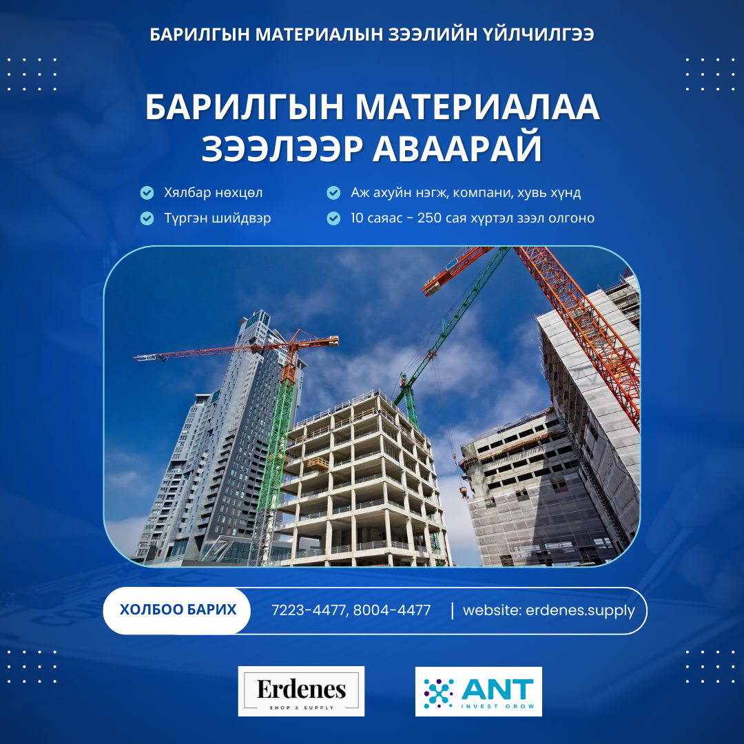 Барилгын ажлаа зогсоохгүй үргэлжлүүлмээр байна уу? Та ажлаа явуулахад шаардлагатай бараа, материалаа биднээс зээлээр авч, ажлаа тасралтгүй үргэлжлүүлэх боломжтой.